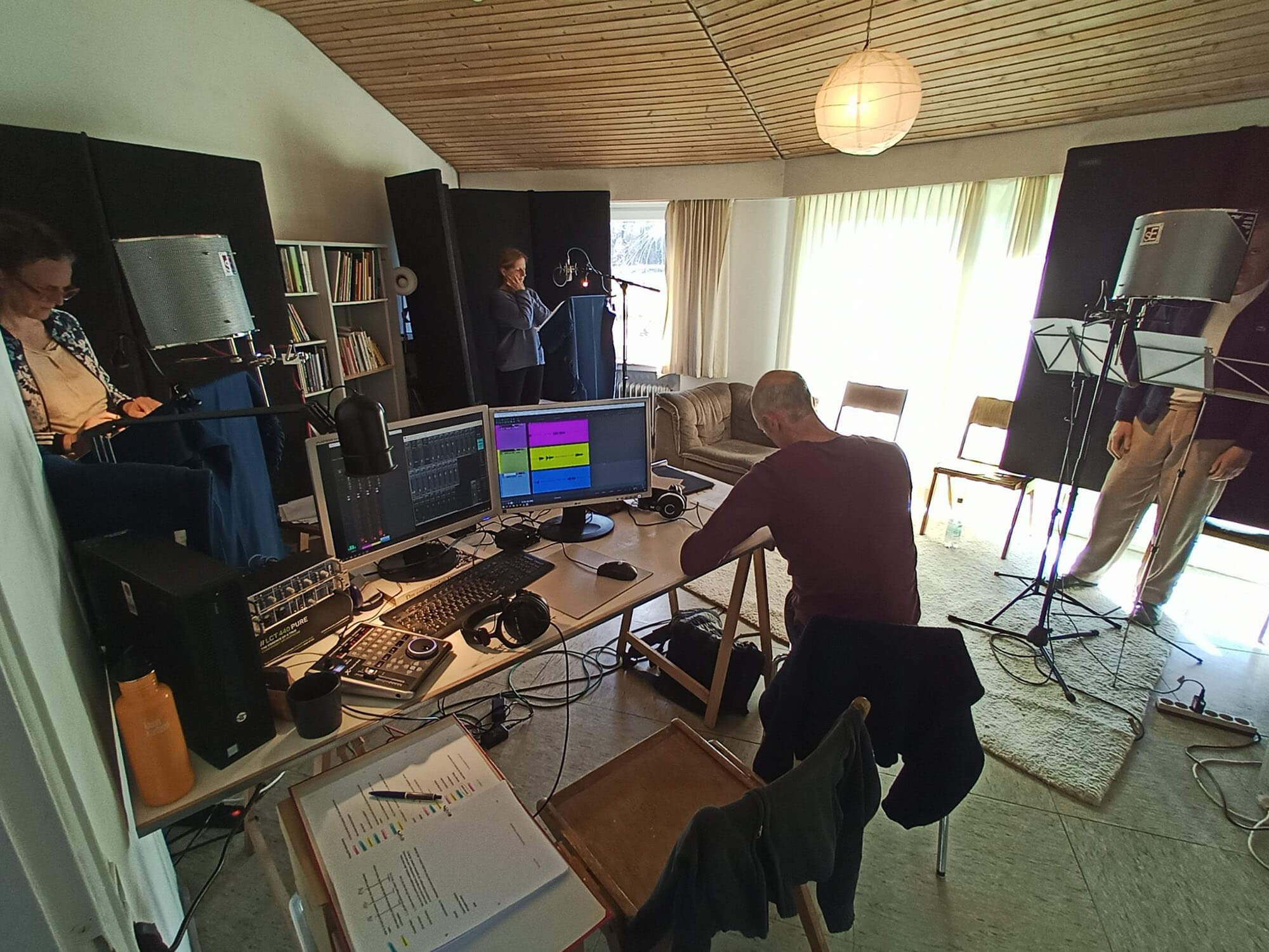Kern und Zentrum von „Beziehungsweisen Worpswede“ sind die O-Töne der 38 interviewten Menschen mit ihren Geschichten. Doch um daraus ein Hörtheater werden zu lassen, sind zusätzliche Stimmen nötig, die das Publikum per Hörspiel quer durch den Ort leiten. Diese Stimmen kommen von den Schauspieler:innen Ingrid Kleinschmidt, Susanne Schrader und Guido Gallmann. Für die zweitägigen Audioaufnahmen wurde in den KünsterHäusern ein mobiles Aufnahmestudio eingerichtet.
